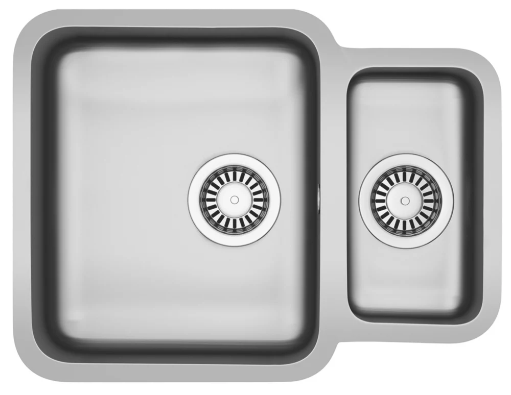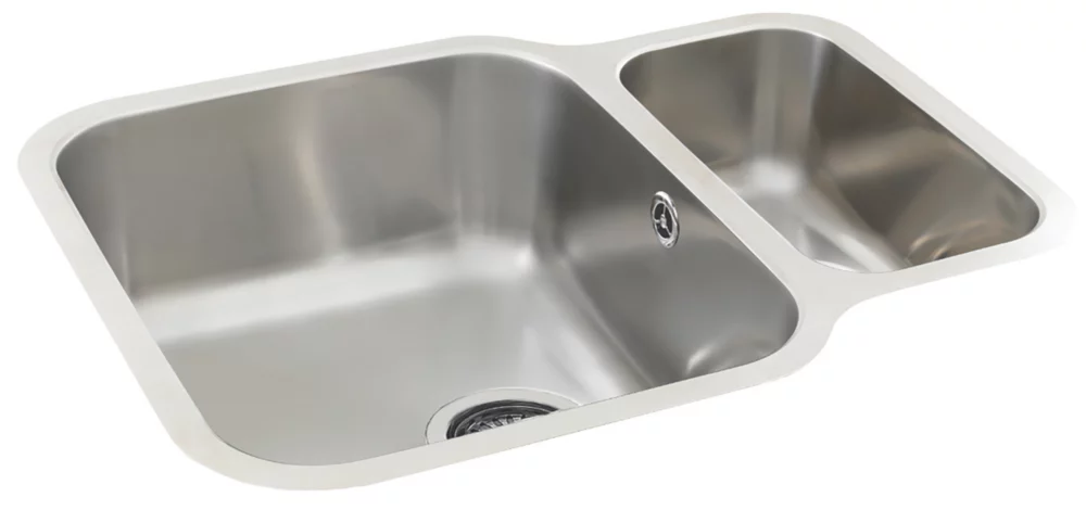 Reversible undermounted stainless steel sink with soft curves and low profile perimeter.