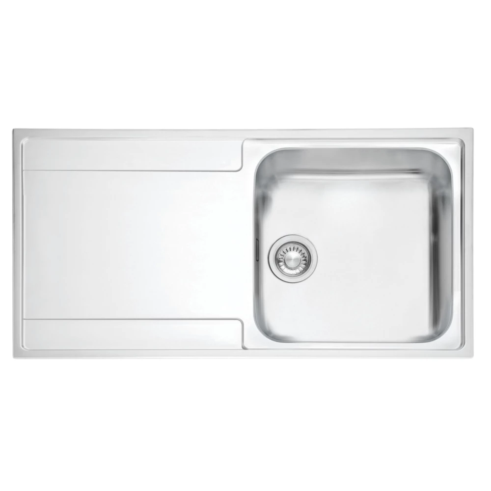 Stainless steel, minimalist sink with ultra slim top profile for flush-mounted installation. Features a spacious main bowl and left hand drainer.