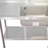 1.2mm stainless steel construction with a sleek, polished satin finish. Features integral drainer and adjustable foot for stability. Simple installation.