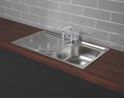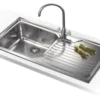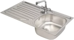 Satin finish sink with solid brass chrome-plated tap. Reversible drainer for flexible installation. Danube tap has a contemporary style and is easy to install.